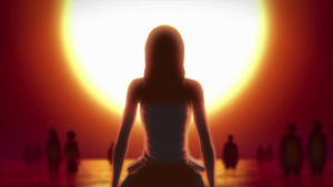 Miu and Miku walk side by side through the Lake of the Departed. Miku explains how she felt about her brother, and how she wanted to be with him. Miu says that she has never had anybody she cared about enough to follow them into the underworld, and she always wondered why, but now she has come to terms with it. As she says it, the light changes, and she looks up to find they are standing beneath the eternal sunset on the border to the other world. Miku, looking up at it, smiles for the first time.