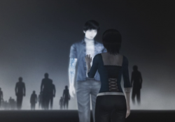 As it drifts out to sea, the lanterns are able to move freely on the current. A light grows on the horizon, and in the distance stands a crowd of shadowy figures. A similar shadow rises from each floating lantern as the souls of the dead are finally able to cross over. Among the shadows, Rei spots Yuu, walking away from her.